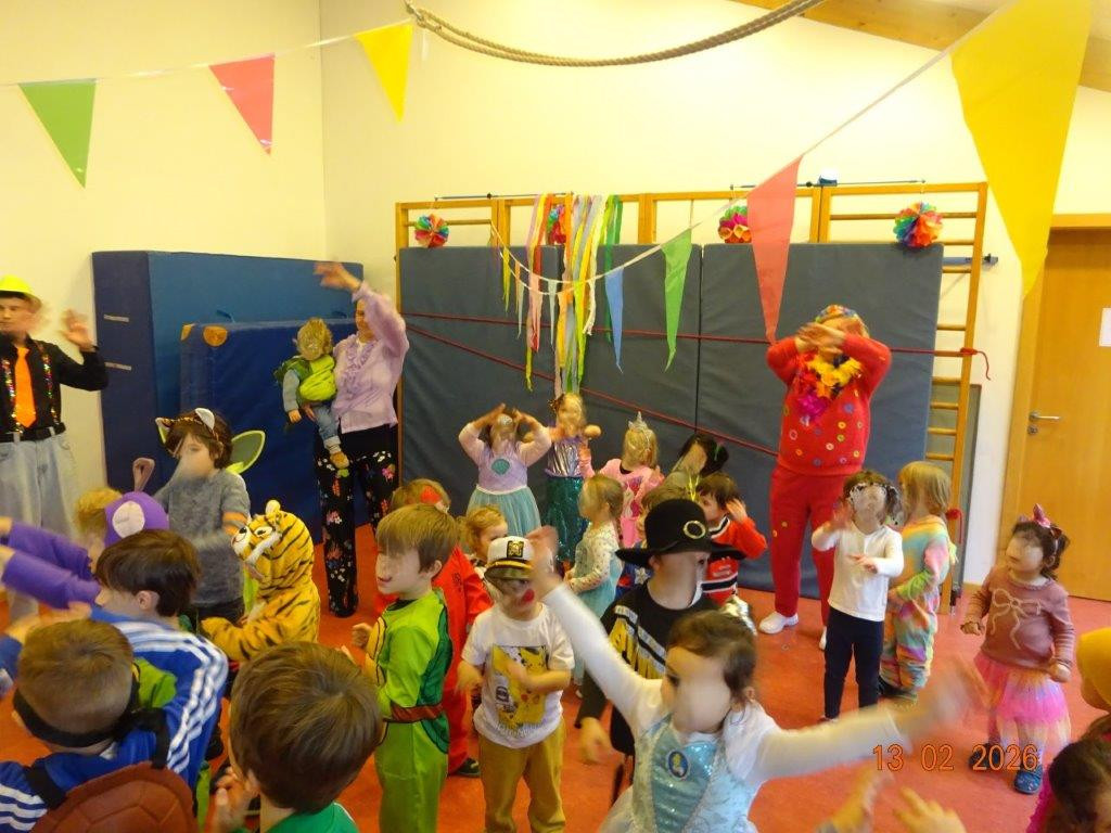 Der Höhepunkt des Faschings war unsere große Faschingsfeier. Die Kinder starteten den besonderen Tag in den Gruppen bei einem stärkenden Frühstück. Die Eröffnung der Faschingsfeier starteten die Kindergartenkinder mit einer bunten farbexplosiven Polonaise durch das Kinderhaus, bei der natürlich auch unsere Kleinsten nicht fehlen durften. In der Turnhalle sorgten Faschingslieder für die richtige Feierlaune. Da duften Lieder wie „Gute-Laune“ von den Großstadtengeln nicht fehlen. Danach haben sich die Kinder auf fünf Stationen verteilt. In der Kinder-Disco gab es eine beeindruckende Lichtershow und die Kinder haben getanzt. Es wurden lustige Spiele angeboten wie „Farben schnappen“. Bewegung und Konzentration waren bei einer Farben-Bewegungsgeschichte gefordert. Eine bunte Girlande entstand, bei der alle Kinder einen Wimpel mit Fingerfarben, Aufkleber, Stempel, gestalten durften. Für eine kleine Verschnaufpause wurde eine Bücherecke angeboten. Danach haben wir uns mit deftigen Muffins, Lachsbroten und weiteren Leckereien gestärkt. Abschließend haben wir nochmals alles gegeben in der Kinder-Disco. J Am Ende des Tages blickten wir auf ein gelungenes Fest zurück, das die Vielfalt und Lebensfreude der Kinder wunderbar sichtbar gemacht hat. Die Faschingsfeier unter dem Motto „Farben“ hat unser Kinderhaus zum Leuchten gebracht und viele schöne Erinnerungen geschaffen.